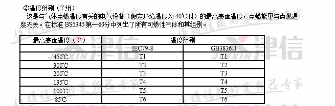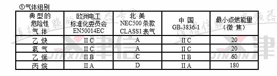 注:中國GB3836標準規(guī)定ⅡC級最小點燃能量為19微焦耳,ⅡA級最小點燃能量為200微焦耳。氣體分組和點燃溫度,在一定環(huán)境溫度和壓力下與可燃性氣體和空氣的混合濃度有關。